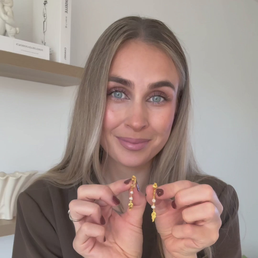 Vores Dangle Perle Øreringe Guldbelagt er et par hængeøreringe med et feminint og detaljerigt udtryk, der både fungerer perfekt alene eller i kombination med andre styles.