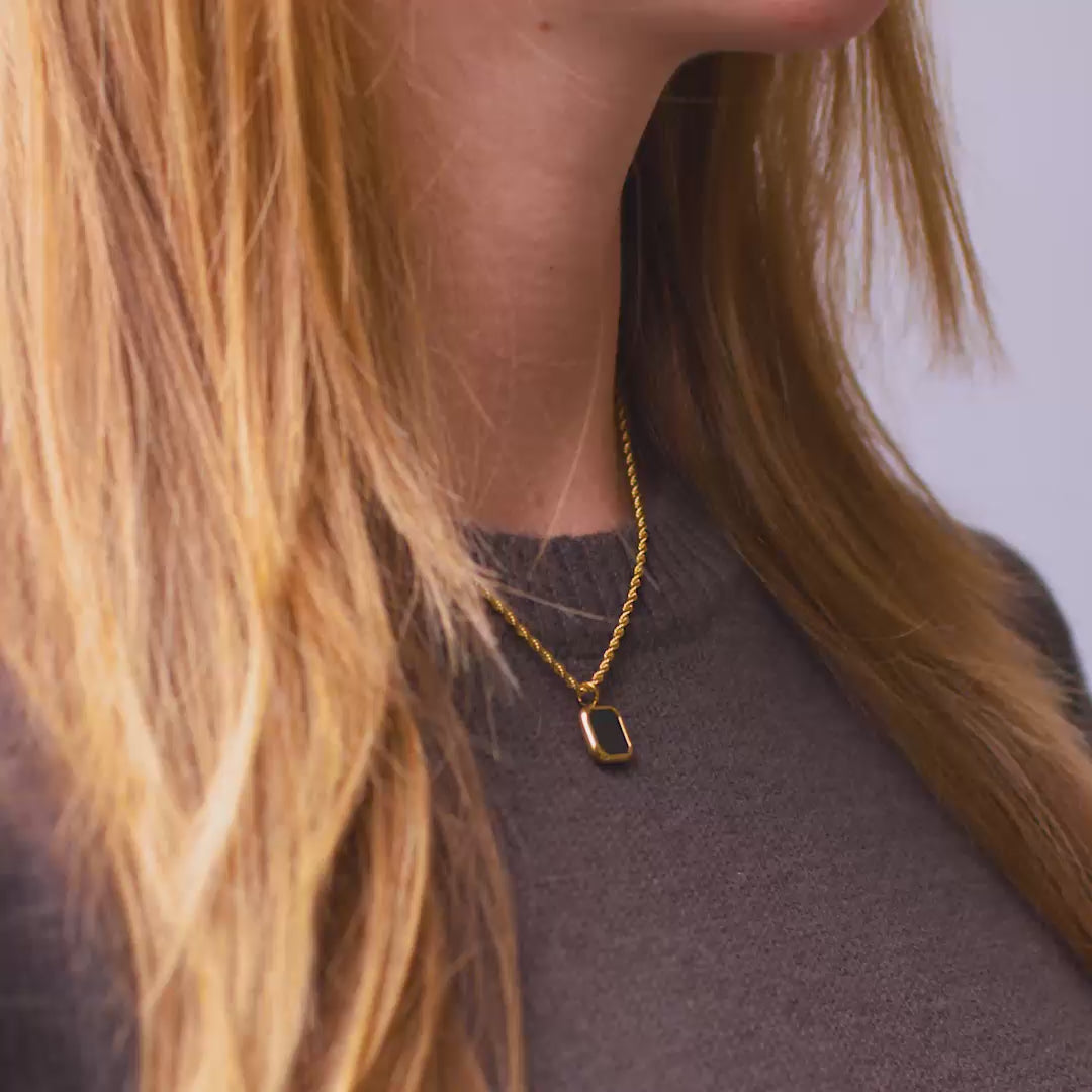 - Halskæden er af rustfrit stål belagt med 18 karat guld + PVD-coating. Smykket er vandfast og allergivenligt, blyfrit og nikkelfrit jf. dansk lovgivning.