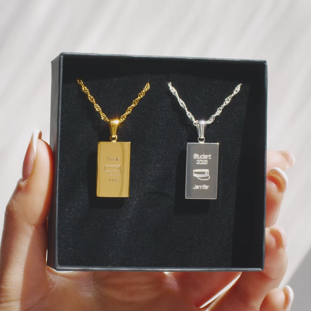 Med vores Student 2025 Halskæde kan du give den perfekte studentergave med personlig værdi og betydning. Vores smukke Sun Firkantet Halskæde er indgraveret på indersiden, så den kan vendes og vises frem efter behov.
